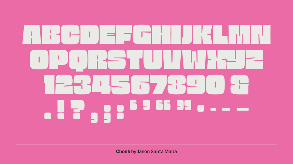 Chonk is a heavy display sans that likes to take up space. It’s best used in moderation, when you want to be LOUD. The inspiration came from playing with my kids’ Play-Doh extruder, and seeing how much clay we could cram into the molds. I wanted to make a typeface that tried to expand to fill its container in the same way, which is why there’s a slight convex touch to the verticals: the whitespace pushes out, while the letters push back.
